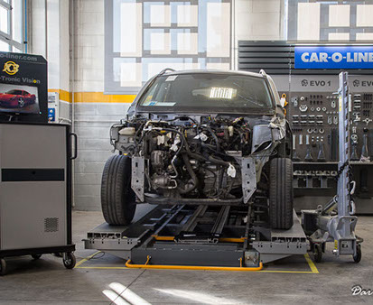 Su un banco di tiro Totem Spanesi e un sistema di tiro Quick 42 Car-O-Liner vengono eseguite le riparazioni strutturali più corpose, con sistema Evo di ancoraggio, morsettamento, tiro e torsione per diagnosi, sistemazione e controllo qualità.